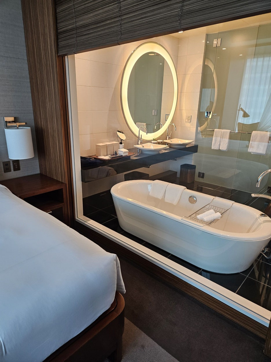 콘래드 도쿄는 미나토구 히가시신바시, 도쿄 중심부에 위치한 고급 호텔로, 도시와 바다를 모두 감상할 수 있는 멋진 뷰를 자랑해요. 저희는 ‘이그제큐티브 트윈룸’으로 예약했고, 1박 기준으로 백만원 초반대였습니다.