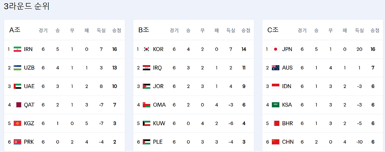 | 3위 | 🇴🇲 오만 | 9점 | 6경기 | 3승 | 0무 | 3패 | -1 |