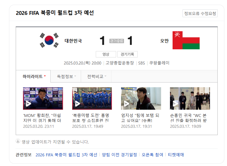 2026 FIFA 북중미 월드컵 아시아 예선 B조 7차전, 대한민국은 오만과 1-1 무승부를 기록했습니다. 황희찬이 전반 41분, 이강인의 패스를 받아 선제골을 터뜨리며 분위기를 끌어올렸으나, 후반 35분 오만의 알 부사이디가 동점골을 넣으며 경기는 무승부로 끝났습니다.